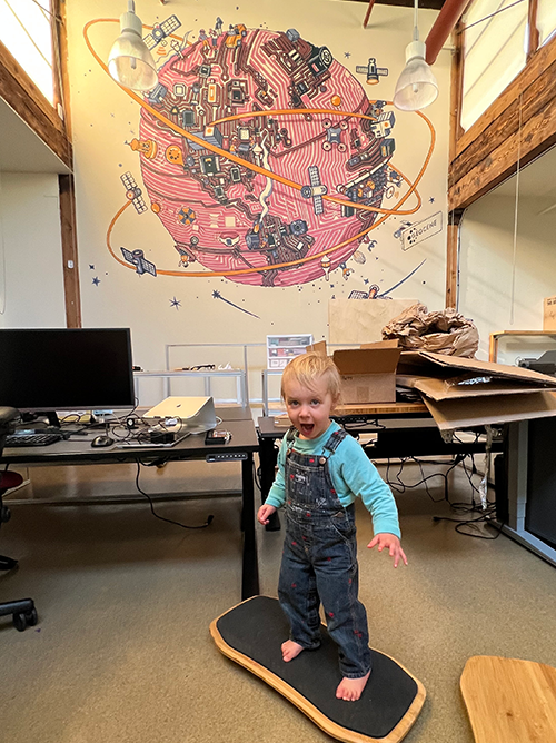 - Nigel totally rocked that mural on the wall in the new office. Almost as much as my older daughter, June, is rocking that balance board in this photo from moving day. We love being back in Berkeley, Geocene’s birthplace.